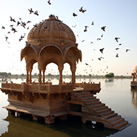 The Golden Oasis : Wake up early in the morning to attend the Mangal aarti (prayers sung in praise of God) at the Gadsisar Lake. On completion of the aarti you return to the hotel for breakfast after which you set out to see the astounding Jaisalmer fort and the royal cenotaphs.You will then be dropped at the venue of the festival. Rest of the Day is for you to enjoy and even participate in the various programs of the Day that include the Turban Tying Competition for Indians and foreigners, contests for the best moustaches, Mr. and Miss. Desert followed by Surya Kiran Show (acrobatic performance) by the Indian Air Force. At the end of the Day are held various folk dance and music programs and fire works display - but we suggest you to return to the hotel after air show and attend the music programs the next Day.